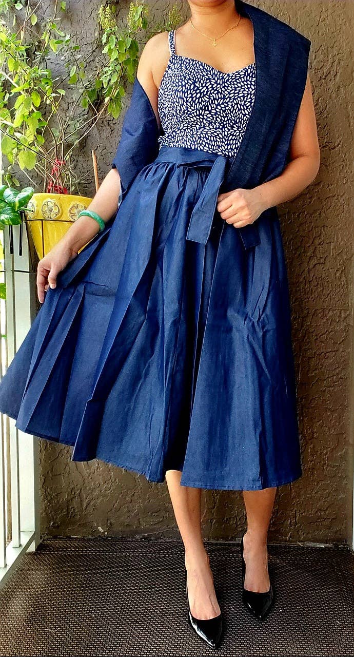 This mid length denim skirt is a versatile and fashionable choice for women. It features a flared design and convenient side pockets. Additionally, it comes with a complimentary head scarf and is available in a free size that comfortably fits individuals ranging from small to 3XL. The length measures at 30 inches, making it suitable for a range of heights. The dark blue denim color adds a timeless and sophisticated touch to any outfit.