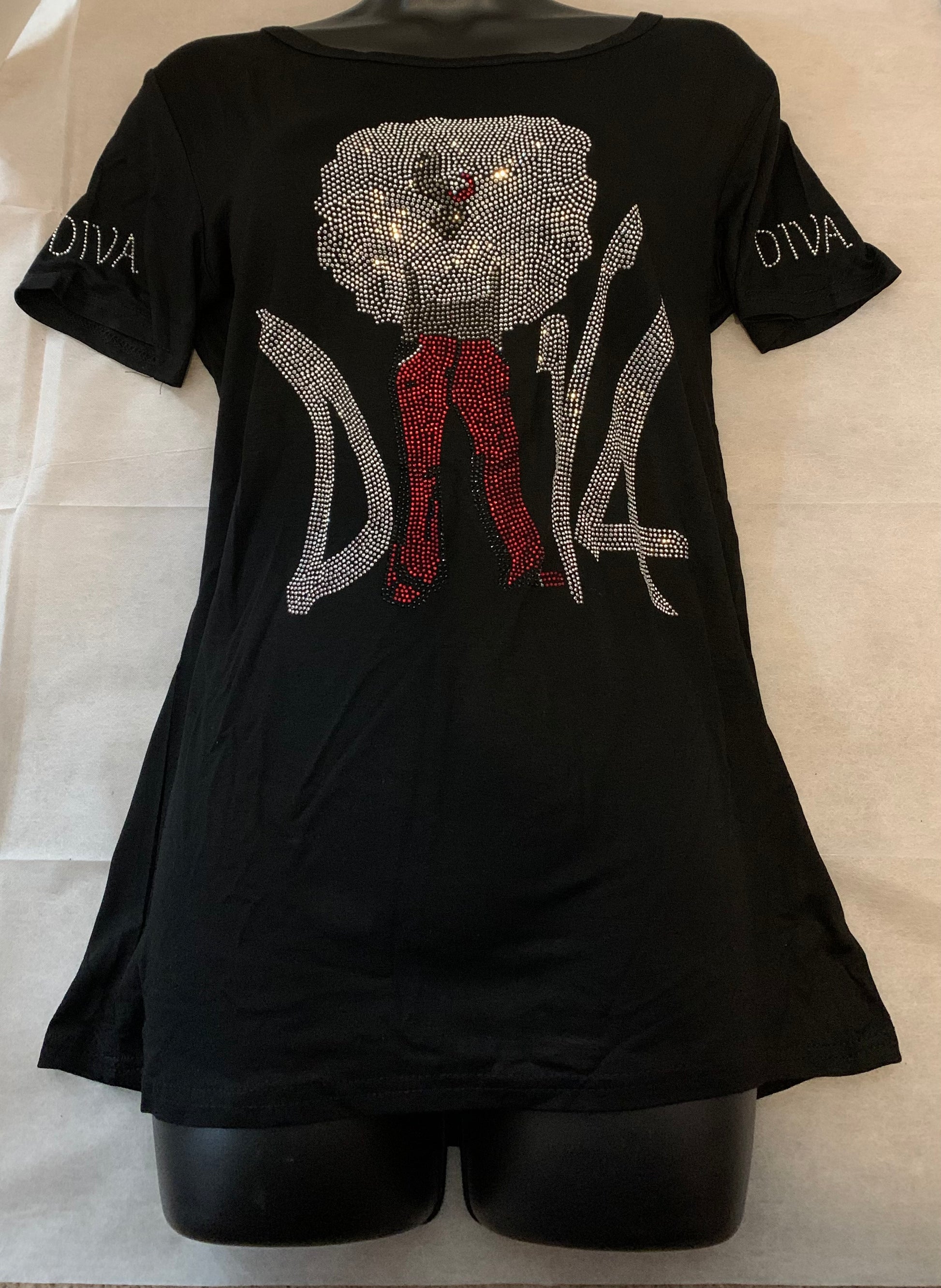 Show off your sparkling style with this hot Bling T-Shirt, dazzling with rhinestone graphics! It's the perfect choice for razzle-dazzling your wardrobe. Ooh la la! 95% rayon 5% Spandex one size fits up 3XL.