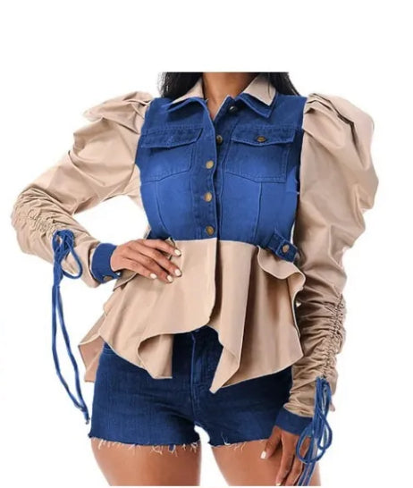The Puff Sleeve Jacket Shirt is the perfect combination of style and comfort. The draw string sleeve detail adds a unique touch while the asymmetrical bottom provides a flattering fit. Stay on trend with this denim jacket shirt and elevate your wardrobe! runs 1-3cm smaller