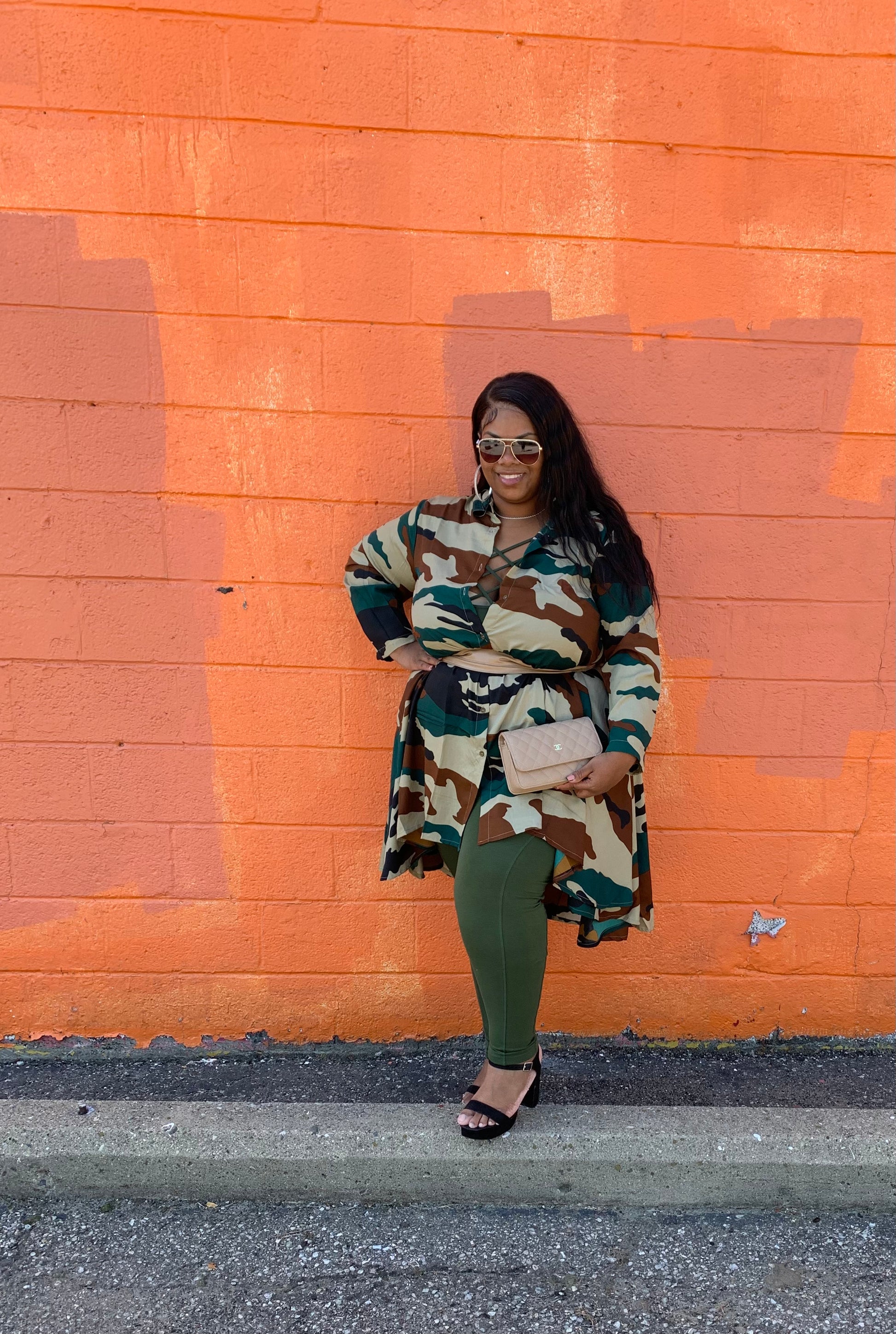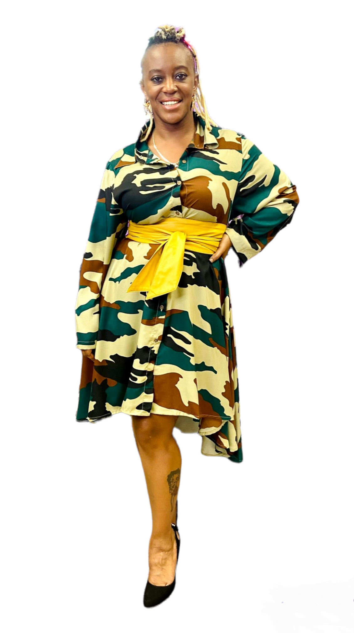Look stylish and perfectly on trend with this high-low swing dress. The soft and lightweight fabric features an army print design that will add an edgy touch to any outfit. Look and feel amazing in this high-low shirt dress. Woman collared button down hi/low shirt / dress. Has long sleeves . Can be worn belted or loose. Belt not included. 100% Polyester. One size fits most (m-2xl) Color: earth tone