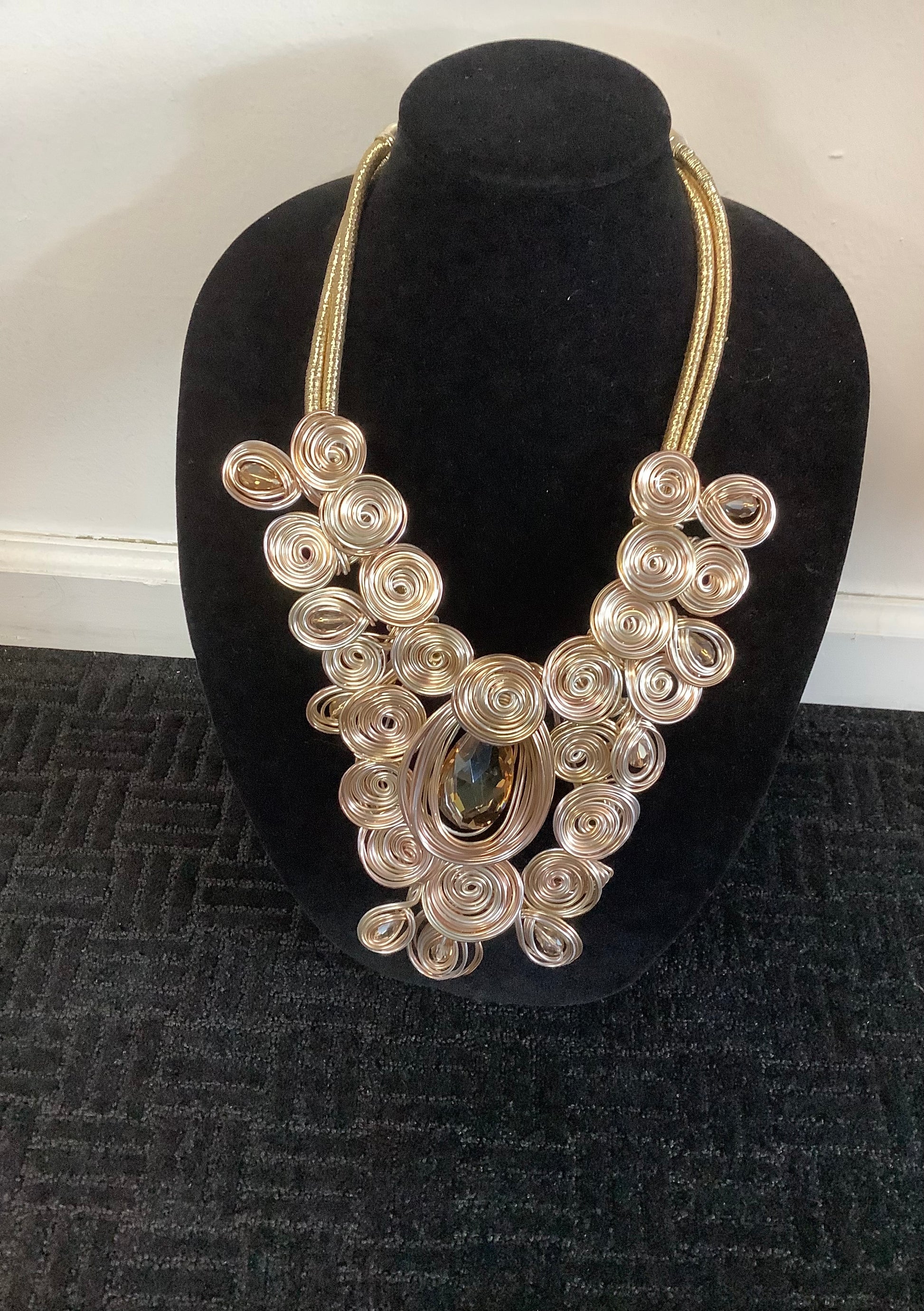 - This statement necklace is a bold and eye-catching piece of jewelry that adds a touch of glamour and personality to any outfit. It features an intricate designs, vibrant colors, and a larger size to make a strong impact. Made with various materials such as glass beads and metal, this statement necklace is designed to become the focal point of an outfit. It can be worn with both formal and casual attire, instantly elevating your look and making you stand out from the crowd. From intricate patterns to unique shapes, a statement necklace is a true fashion accessory that allows you to express your individual style and make a lasting impression.