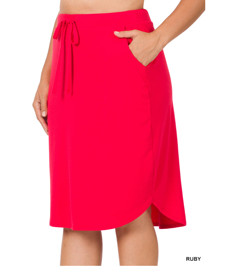 Get ready to tulip-twirl with this playful skirt! The elastic waist and side pockets make for a comfortable and practical fit, while the unique tulip hem adds a touch of fun to your outfit. Made with a soft blend of polyester, rayon, and spandex.