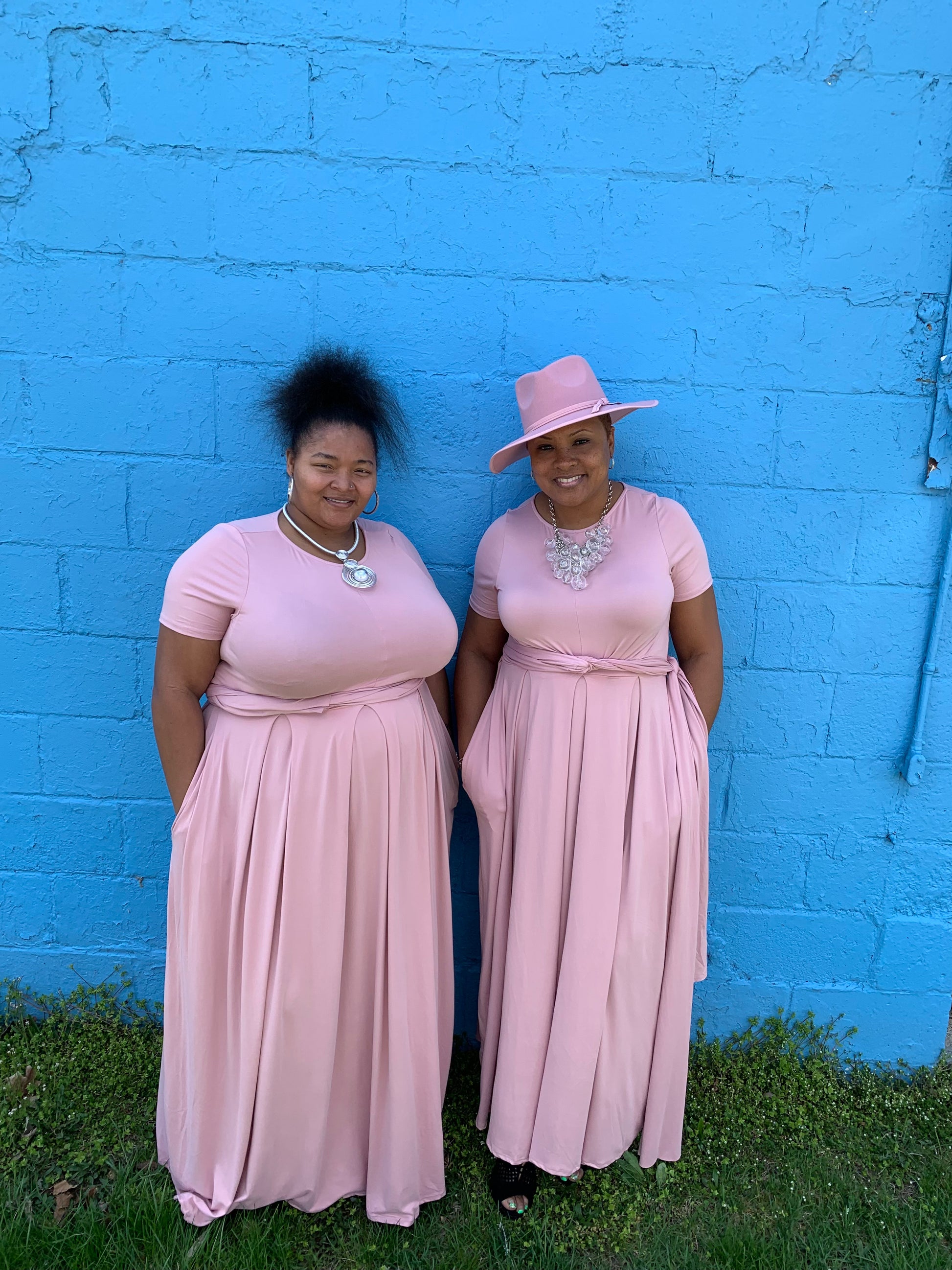 This soft pink set includes a blouse with a belt and the skirt has two front pockets.